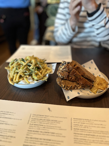 11 April 2023 - A first, lunch-time visit to this much anticipated addition to the Guildford dining scene, no doubt angling to pull in regulars from The Ivy, Cote and our established independents. Initial impressions were excellent with a genuinely warm Coppa Club welcome. This theme happily continued with friendly and professional service throughout. Once seated, we chose some "nibbles" to accompany our Aperol Spritzes - Zuchinni Fritti, crisp, well-seasoned and very moreish, together with Warm Seeded Sourdough with date and sea salt butter which was fresh and delicious. The nibbles arrived before the spritzes, so we were glad to have already been provided with a complimentary bottle of water. We decided to keep it simple for our mains - a Margherita Bufala pizza, classically done, nicely balanced if a little hard to cut (well spotted by our server who proactively brought us a steak knife); and Plancha Grilled Herb Chicken which was super tasty, with an accompanying mint- and radish-infused salad and perfect fries. Mid way through the mains we threw caution to the wind and asked for a couple of glasses of the house white wine, a light and zesty Italian Veneto. It was indeed light and zesty and a good lunchtime choice, albeit arriving at the table moments after we finished our mains. After settling up, we had a quick peek in the top floor cocktail bar which looks fantastic - definitely somewhere to return to for a sophisticated evening out. Finally we had an un-hurried coffee in the light-filled downstairs cafe, with a seat by the windows perfect for people-watching on the High Street - we both felt that this space offers something special that you don't get elsewhere in Guildford. Having been fully open for little more than a week, we anticipated that we may encounter a few "teething problems". In our case, we were a bit disappointed with the table we were initially offered; we moved to a slightly better one, but still felt somewhat "side-lined" (note to self: request banquette seating or a table near the windows for future bookings). Also, our bills in both the restaurant and cafe had to be re-done due to minor errors - not ideal if you're in a rush, which fortunately, we weren't! - but these small issues were quickly resolved. Overall, we left The Guildford Townhouse with a warm and satisfied feeling - charming service, well-executed food and a classy, relaxing environment. And plenty more to discover on...