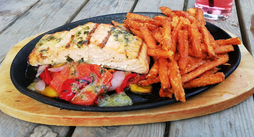 Read moreI went here to meet a friend for a birthday meal. The bar area is a little dark but there was a pleasant welcome and the staff were charming and friendly. We sat in the beer garden to eat. I noted that there's a big sign saying dog friendly. It was certainly family friendly too which was very nice to see. There was an app for ordering from ones phone which I found a little impersonal. However my young friend did the ordering and we both chose the Cajun salmon. Often salmon is either slightly too undercooked or dry. This was not. It was fresh and cooked to perfection with just the right amount of spice to lift the flavour without overpowering the fish. The hint of garlic and the bed of beautifully cooked peppers, onions, and courgettes complimented it beautifully. The accompanying sweet potato fries were crisp, light and very tasty. The apple and blackberry crumble I had for dessert was tart and refreshing with a delicious sweet buttery crumble topping with ice-cream and a little jug of custard. The portion sizes are generous and the prices extremely reasonable. The only downside was I was too full to finish the crumble. I can...