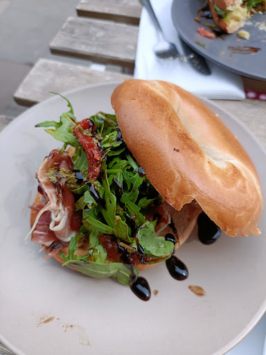 Next up were out bagels. Layers of salty prosciutto tucked in to the soft chewy warm bagel with peppery rocket, sun dried tomatoes which gave an occasional pop of sharp intensity and a thick sugary twang of balsamic glaze. Delightful!