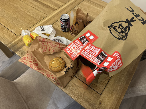 Read moreWent to the KFC, new one by Asda, first time customer at this branch. I've been eating KFC for 40 years or there abouts. I used the screen ordering system, ordered a zinger burger with no extras, and a boneless box. Had no option to remove the chips, as since KFC has changed them they are minging, soggy excuses for a chip. Ordered the gravy, which is now thin and tasteless, or is from this branch anyway. Also paid extra 40p for Tropicana. When I completed the order I waited for my receipt from the machine, but got nothing. I duly sat and waited for my order. The screen then changed to say mine was ready to collect, luckily I remembered the number, as no receipt. But nothing was ready for 5 minutes. When it was ready, they tried to give me an orange fruit shoot, I said I didn't want it twice to the girl, who informed me this was what they offered in replacement. I got tango instead which I don't like. Dips I had ordered were not in the bag and the boxes hadn't even been attempted to be closed. When I got the 'meal' home it was cold, only a five minute drive, so had to nuke it. Only realised when I got home that they hadn't refunded the 40p. One person seemed to be actually doing the job properly while the rest looked clueless.