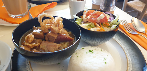Had the pleasure of being taken out for dinner at Remy's this evening on Kings rd, St Leonards. This was the first time I had been there along with my wife courtesy of two friends. This restaurant had formerly been a cafe and many years before that an Edwardian dairy shop. The shop front is notable for its beautiful curved bay and Arts & Crafts period detailing. The Interior is pleasantly lit with a cosy warm feel to it and at time of writing a nicely decorated Christmas tree in the window adjacent to our table- very festive. This is a Filipino restaurant that is popular with Filipino medical staff up at the Conquest hospital, apparently popular with them due to it's authenticity and great atmosphere - a pretty good place to start. Unusually perhaps, they also serve Tapas on a Thursday evening and English dishes during the daytime period. Onto our food: My wife and I started with the 'Filipino Siomai,(steamed minced pork dumplings) and the 'Lumpiang Shanghai'( pork/veg mini spring rolls). Both were exemplary and homemade and served with nice dips- delicious. Next up my wife opted for a daily special of steamed Sea Bass and for myself the 'Lechon Kawali',( Filipino crispy pork belly). Both were excellent. My wifes fish arrived with wilted pak choi,fresh flavours of ginger and spring onion and a delightfully light broth. My pork was quite chewy but well seasoned and satisfyingly meaty with its serving accompaniment of 'mang tomas sauce' providing the sweet sour notes of tamarind to counterpoint a fresh salad and some lovely sweet potato chips. The fish was served with jasmine rice which was plain but tasty. As a side dish I ordered a substantial 'Mango salsa salad' which had an excellent balance of salty sweetness. To finish we ordered 'chocolate brownie', 'Mango cake' and 'Lime & Pistachio tart'. All were not overly sweet and had a superb texture. Even the coffee to finish was amongst the best I have had, not bitter or grainy, just pitch perfect and full bodied. The service was congenial, menu-informative and friendly . Before leaving we chatted with the owner and his wife who were delightful and who evidently take great pride in their eatery. Great food and great service. The bill?- damned reasonable by any expectations of eating out, around £11 for a main and £4-50 for a dessert. I'd even chance my arm to say its amongst the very best value in a resurgent St Leonards. If they don't become the go-to for cosy diners then I'll eat my hat but first I have...