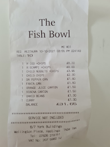 Read moreMy partners review when asked was "Eh, it was nice", but I'll elaborate. I was recommended Fish Bowl by friends so, being the fish and chip connoisseur I am while on holiday, I figured, why not. Having savoured quite a few, ok, a LOT of fish n chips over the years, and more recently this last two weeks, I can safely say, "it was nice". The chips were not greasy at all, and portion sizes were generous. (Personally I prefer the more chunky greasy kinda chip but I wont hold my personal taste against them) The fish tasted fresh and, of fish. What made the difference In my opinion was the great service, genuinely friendly staff who seemed happy to help, spoke nicely and smiley with the kids; nice light, clean, spacious interior and clean poop room. Will def return to have both fish n chips again and test...