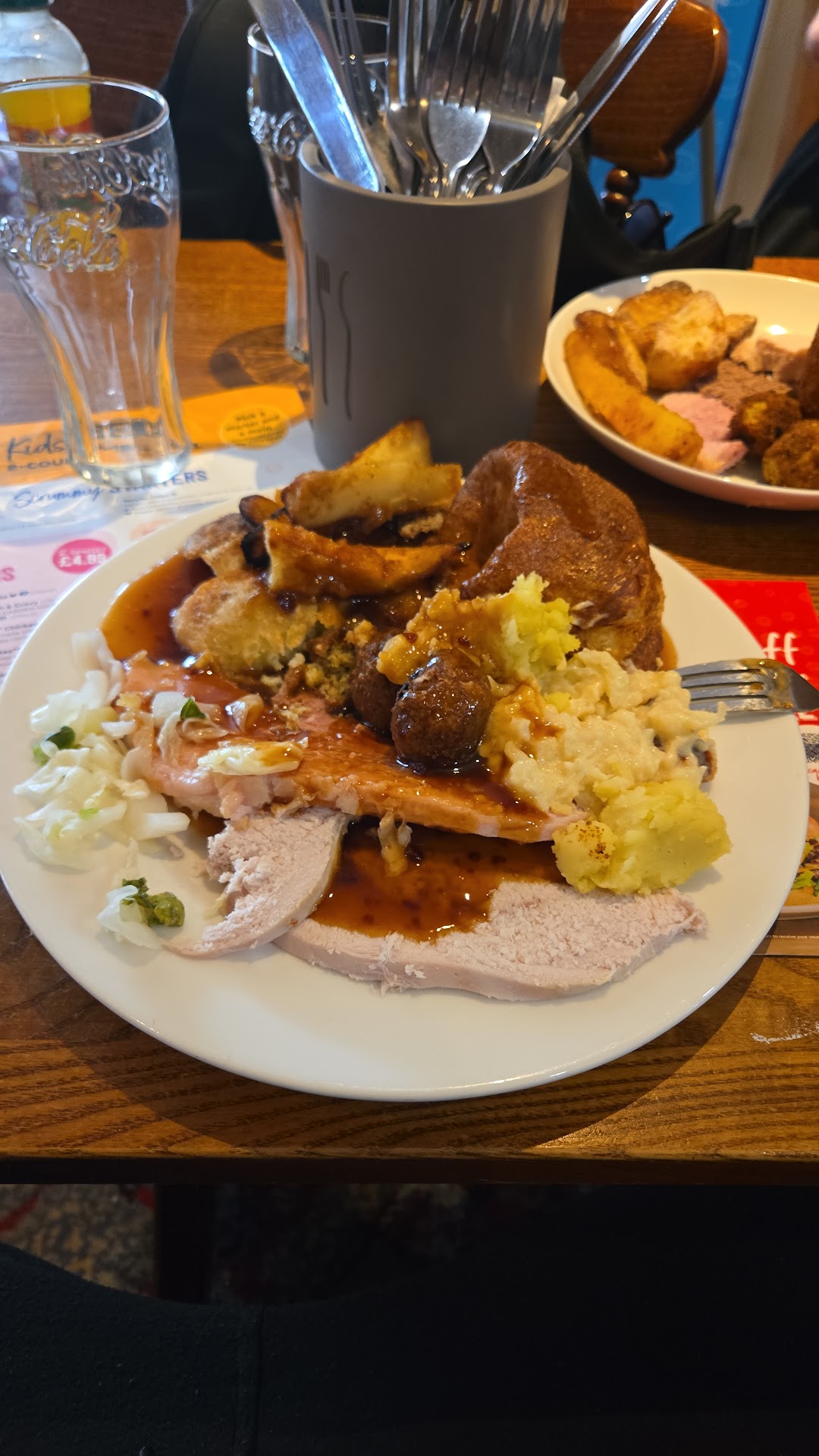I originally booked a table online for 1815 and then wanted to change the time after personal commitments changed so wanted to change to 1730 so I phoned and they couldn’t find my booking so made another one. One of the party was on a walking stick so still sat us away from the main area and nearer the soft play after I asked to be close to entrance as possible. We were told our table numbers and then told to order at the bar not a problem but when you had a queue and the bar only had 2 workers on the bar and others standing around. I wouldn’t mind but the restaurant wasn’t busy.