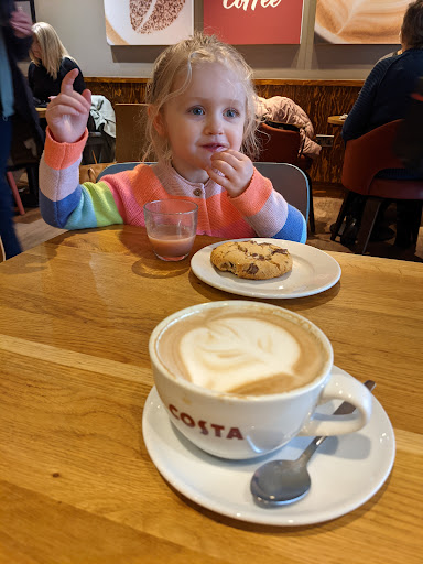 So a freezing cold day in early January, and my car is going for a service and mot. Will take at least a couple of hours i'm told... I dont know the area but thought I would walk and see what I came across. After around 10 minutes, I could smell roasted coffee, and in the distance I could see the costa logo. Warmth woohoo! In I head, to be greated by a very friendly female member of staff, who enquired about my day - I explained why I was in the area, she told me not to rush which I thought was really nice. I have my medium special blend cappucino with a shot of caramel - lovely - and a toasted sausage bap also really nice. I sat on a comfy chair, I used the free wifi, and read The Times (how civilised). I spent about 1.5 hours there and for £6 I thought it was a bargain really. Whilst there I watched the two female members of staff, and I was impressed at the dedication they showed to their roles, talking about what they needed to do next, always making the time to say hello and show interest in their customers. Ultimately, its not just a good cup of coffee that makes a venue, it is also the overall enviroment and I would recommend based on my...