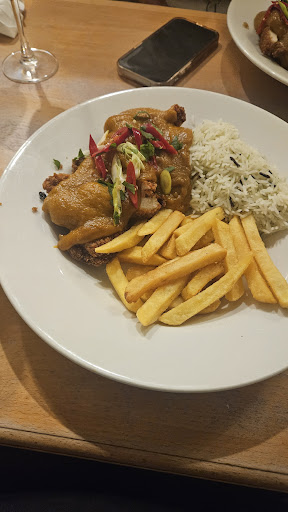 So then the food ..... Hunter's Chicken arrived. It had obviously been made earlier and re-heated.... to a ridiculously high temperature whilst the chips were partially cooked.
