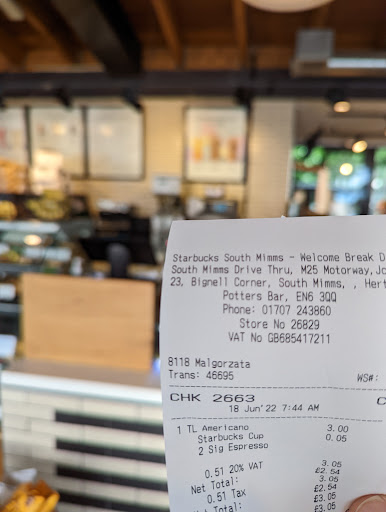 Read moreI visited this Starbucks Drive Thru South Mimms on Sunday 22nd November at around 2.30pm. I ordered a Soya Chai tea latte with an extra pump of chai. Upon receiving my drink, I had a quick taste and I requested one more pump of chai. The server I spoke to (short South Asian girl) clearly annoyed, looked at me like I was an irritation and begrudgingly added one more pump. I then looked around to find sugar but I’m guessing because of Covid it was behind the counter. I asked the same girl for some sugar and again you would have thought I asked for a kidney. She actually even rolled her eyes at another staff member. She didn’t bother to ask how many I wanted and shoved 7 packets in my hand. A few of them had split and sugar was spilling everywhere. I’m not sure what I did to deserve such attitude. My requests were reasonable and I asked politely. I sincerely advise that she be retrained or perhaps not work in Sunday’s if it’s too much of a strain on her. She is a discredit to your store. I regularly visit the drive thru on the way to work and the staff are always pleasant and the drinks spot on. She really let the team and the store down today. Extremely...