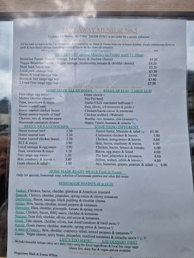 Read moreRead the rave reviews so felt time to try eat at No 5 ... sadly not that good , wife's salad was fine (hence the 3 stars) and I ordered a BLT with mayo ... not sure where the idea mature cheese should be added and become the overriding flavour and worst of all not only did I not expect cheese to be on a Bacon Lettuce and Tomato sandwich I don't eat strong cheese so sadly was a waste of money... a bit like ordering a cheese sandwich and finding bacon in the middle of it... Can't recommend on my visit as my opinion is only based...