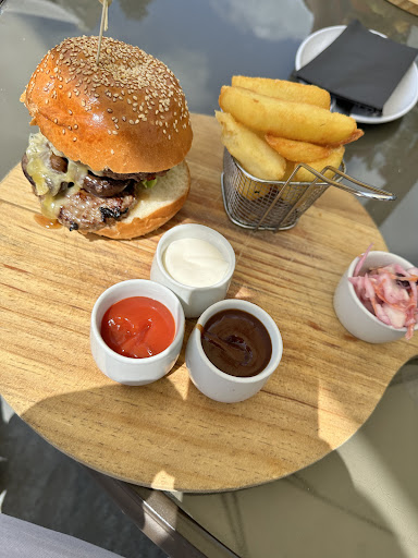 Visited the Black Bull today after reserving lunch at Willows cafe but we soon found out they stopped serving hot meals in April so needed to find somewhere quickly for our party of 3 and stumbled upon the Black bull a real gem to be honest, large car park and huge beer garden and lovely patio., we ordered drinks and was given some menus including todays special menu, the special menu seem very overpriced and not that interesting but I guess that’s a personal view point. Decided upon the Royal Blue burger that comes with chips and coleslaw and a selection of sauces presented on a wooden chopping board.