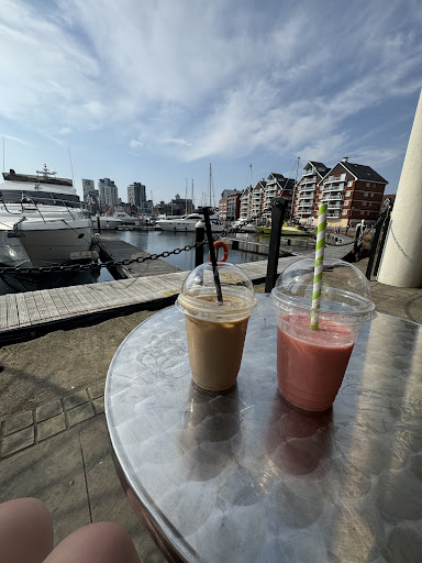 There’s a few tables outside, what a beautiful view! (See photo) I had a medium iced latte, absolutely lovely. Reasonably priced, £3.30 I think. About £3.70 for a large. My friend had a Caribbean Smoothie. Made to order with frozen fruit. About £4, I think.
