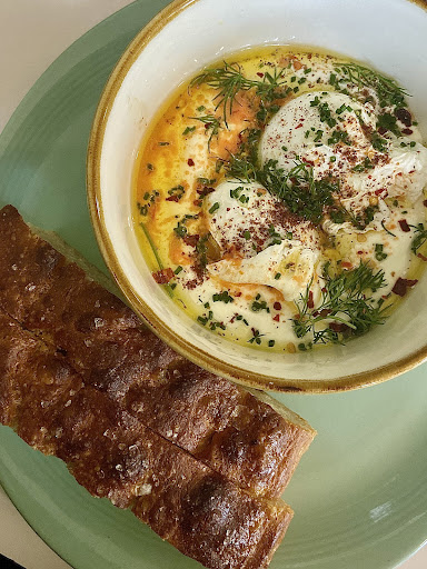 The two female servers were absolutely lovely—so friendly, cheerful, and genuinely helpful, which made the experience even better. We ordered the garlic yogurt with poached eggs and fermented chili oil served with focaccia bread, as well as the cauliflower hummus sandwich on focaccia. To drink, we had ginger beer and fresh orange juice. Everything was out of this world! The flavors were incredible, and my partner and I didn’t leave a single crumb on our plates.