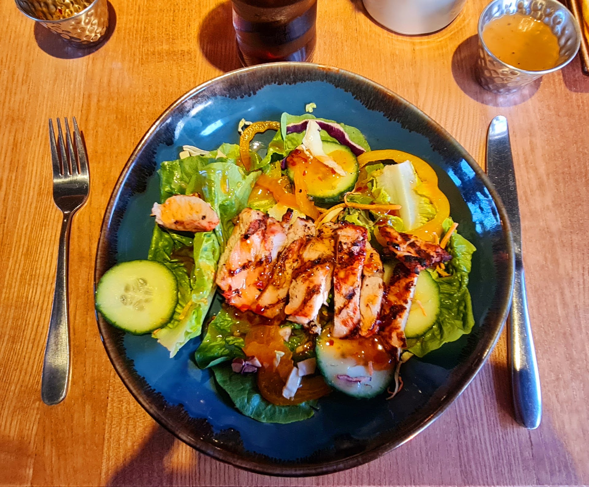 Having finished our starters, we waited for a while and flagged down our waitress to see whether we could go up to the salad bar. We followed and pointed out what we wanted which was put into our bowl. Whilst Kim was very lovely, she did not know how much of what I wanted and I ended up having far to much sauce on things I did not want sauce on etc...