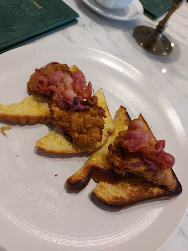 Unfortunately the food was quite frankly lacklustre. I had the French toast but with chicken and bacon to top instead. The French toast was about as French as a Ford Mustang, was limp, soggy and bland. And if it wasn't for the chicken it may as well have been a veggie dish seeing as the bacon was almost non existent. And even the chicken was just not good, being chewy, hard to cut through, and the coating slid off like a runny nose.