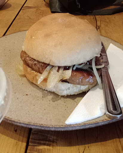 Food. Sausage bap with fried onions. You get a generous portion, with a good choice of condiments. Priced for quality and quantity! The iced caramel latte was delicious!