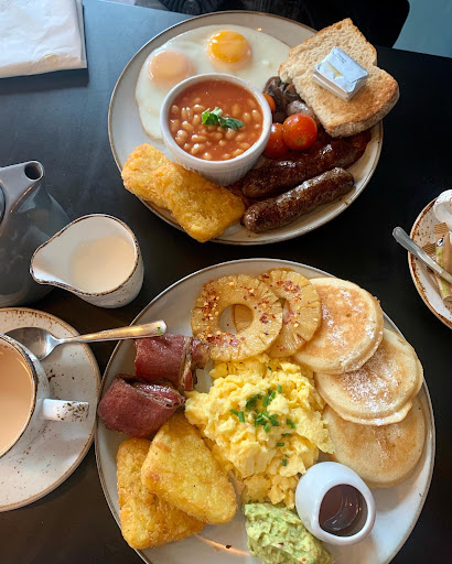 I was super excited to find a halal place with such a great breakfast and brunch menu. What bowled me over were the words ābeef brisketā - how unique!! The cafe is spacious with plenty of parking to the side of the building. Once sat down you scan a QR code on your table to see the delicious menu. Iām not going to lie - I got really excited when looking at it. Then my eyes caught āCanadian breakfastā - scrambled eggs, avocado, beef brisket, hash browns, AND pancakes, caramelised pineapple and maple syrupā - this plate looked so random but iām a person who loves to have sweet after savoury so I thought that this would definitely be the breakfast I tried. My husband went for the full english - fried eggs, baked beans, beef sausage, beef brisket, hash brown, mushrooms, tomatoes and toast. The portion sizes were great value for money. At Ā£9.95 - cheaper than a lot of places weād been to previously AND the fact that we could have meat on top was just chefs kiss My tea came in lovely pot, I got at least 3 cups from it and it was loose leaf tea - which made me happy! Husband said his coffee was lovely. Now lets talk about taste - when my plate came, I just got so excited. I tackled it from savoury to sweet but tried a piece of each thing individually before eating it together. The brisket - ooff melt in the mouth. I wanted more š although I would be too full to eat it. Hash browns and scrambled eggs cooked to perfection. Avocados beautifully seasoned. Then moving on to sweet - i got each pancake, topped it with the pineapple and poured the maple syrup on top. Let me tell you - the chilli flakes on the pineapple is a brilliant touch! The combination of the super sweet, then fluffy pancake and then that tiny hit of chilli - it was just SO good. For me, this breakfast was perfect as I got my sweet and savoury fix all on one plate. My husband said his full english was the BEST one heās ever had!! I tried some of his sausage - and it was juicy and well seasoned.