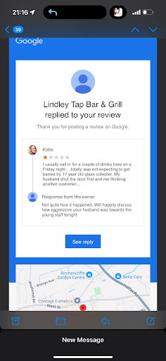 The manager was very unprofessional and extremely rude. My friend had bought me a drink with ice in and as I had a sip the drink tasted warm so I asked my friend to taste it and he said the same thing. The ice was still in the drink so it must have been the glass, having experience working in pubs and bars I know that glasses straight from the glass wash are hot so I just assumed that was the issue. I returned my drink to the bar and informed the bartender about my drink and glass being warm. I told him I wanted to buy another I was just letting them know why I wasn’t drinking it. The manager was stood next to the bartender turned and said ‘well it’s been sat there for 10 minutes’ it hadn’t and the ice hadn’t melted so that wasn’t the issue. I had apologised for complaining and had asked to buy a new drink so I ordered another of mine and one for my friend she said she’ll charge me for just the one. An hour goes by and the football is on so the pub is very loud and lively as expected, She then approaches my table and says ‘I’m sorry but can you keep your voice down because people are complaining’ singling me out on a table of 4. I pulled the manager to the side of the bar to ask why she had singled me out when I was clearly not the only loud one in there and asked if any customers had actually complained which they clearly hadn’t and she said that a few people had. She was being very unprofessional and extremely rude about the whole situation. All of this over my drink...