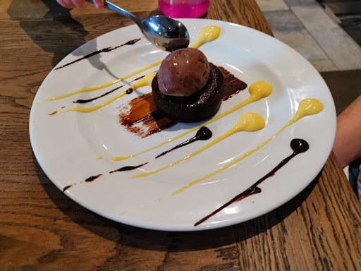 Visited for a beer and some food with wife and infant daughter, large carpark, is located at the top of the hill, staff and the locals were very welcoming. Nice selection of ales lagers and spirits. Restaurant section looked to be closed, but the lounge was bright and modern finish. Pub menu was served as per the website but they had a nice choice of specials. Had the special starter peri peri chicken samosa with pickled molis, perfect balance of curried samosa, sharp pickled mooli and spicey peri, came with an interesting almost experimental bread and charcoal garlic butter, mmm yummy main was a wholesome hearty gaint yorkshire brimmed with onion gravey and sausages dressed with a herby oil and fries on the side, was perfectly portioned for a big fella like me, may be too much for some, but a brilliant meal. Finished off with a white chocolate raspberry blondie, with a tart raspberry coolis and custard. Wife had the burger was thick and tasty, nicely seasoned. Daughter had a big portion of fish fingers and chips. Table services was efficient and friendly. Locals were nice to talk to aswell.