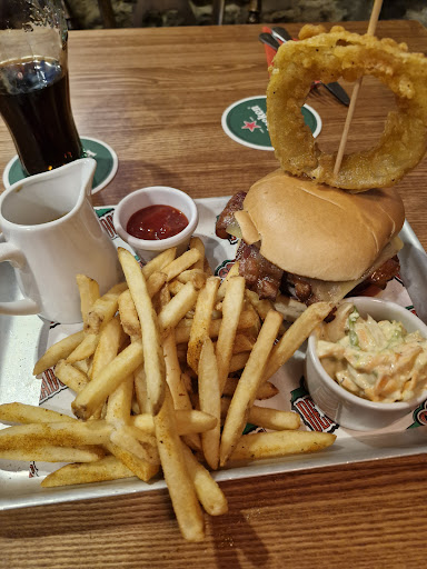 Read moreWe went here with friends for something to eat. The staff were very friendly and inside was very clean. There just happened ro be a wedding reception at the time of our visit so we were restricted as to where we could sit but it was ok. It's old style rustic type decor throughout and very nice. Large car park and outside seating for a sunny day. Good for kids. Plenty of choices on the menu for pub type grub. I have only given it 3 stars because of the food. 3 of us wanted the steak pie but it was unavailable so we settled for the cumberland sausage and mash. The sausages were only luke warm and not freshly cooked, looked as though they had been standing around for a while and dried out with little to no taste.My my wife opted for the fish and chips. The fish was greasey. We probably picked a bad time to eat as they were serving the wedding party at the same time so they were probably pre prepared and warm ups. The prices are reasonable if the food is well prepared but not if this is the standard. We will give it another chance as it is a nice pub and the surroundings are good. Hopefully the food...
