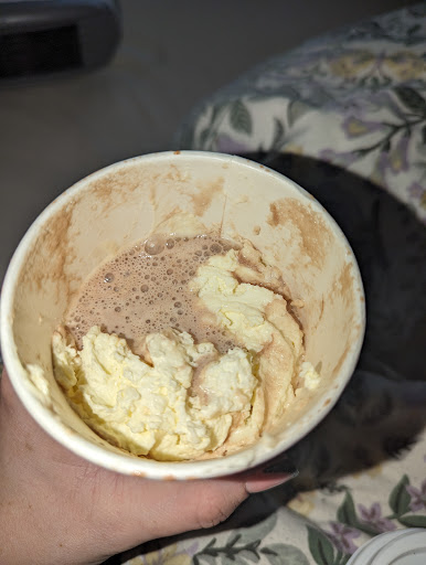 Had the Salted Caramel Frostino with Coffee which was delicious - BUT it needs to be served in a larger Latte Glass NOT a small tumbler. The drink was over-flowing the tumbler. The assistant gave me TWO paper napkins which became saturated before I could pick the drink up ............... I had to REQUEST a small plate for the drink to go on - even though the assistant could see that I was struggling! Not a brilliant 'Customer Experience'!