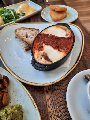 Read moreCame for lunch today after craving the sweet chilli wrap I had a month or so ago. Little gutted to see it wasn't on the menu but still plenty of choice. Now it's a popular cafè in Lancaster so normally is busy, we did mange to find seating downstairs. You cam go up and order or the tables have QR code to open menu, order and pay from your seat. I chose this option. Ordered flat white coffee and Americano. The coffee is very nice here, not weak or watery. It had a good kick to it but not the usual strong after taste you can get. Food order was one mozzarella, buffalo tomato and pesto toastie which came with some fries and a small side salad. Second sandwich was a Ruben (pastrami, pickle and onion chutney on this one) again with fries and small salad. The pesto was one of the nicest home made fresh ones I've tasted, not oily or too heavy and mozzarella was light and nice. The fries here are lovely, have skin on but cooked crispy (but not over done), not oily and seasoned already with salt. The Ruben had a good amount of pastrami on it and pickles, I tried a bite and I'll order that myself next time. Bill came to around £24 for lunch. The cakes in here always look so tempting! Definitely worth a try weather it's breakfast, lunch or dinner...