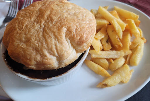 We had heard good reviews so decided to try.Was quite disappointed. .We had a shared starter and everything on it was bought in.Although we did eat it all.My wife had the game pie which appeared to be popular however was 60%meat 40% gravy.(Tasted ok)The boiled potatoes where dry and tasteless. I like potatoes so pinched one and only ate half.I got the fish and chips..I was so so disappointed with that.The fish was a perfect oblong in shape with the batter looking as if was painted on.Meaning not a fresh piece of fish dipped in batter and dropped into hot oil/fat.The chips I'm sorry to say white floppy tasteless things.We had vegetables which came in a small dish and had to be shared between us 2 and another of our party.To cap it all the proprietors dog was in and out of the restaurant and bar area rummaging under our and other diners tables. The bar area actually smelt of dog. Just not what we expected. The staff however where pleasant and friendly. No we didn't complain as there was so much there to complain about we felt that it would have been embarrassing for us...