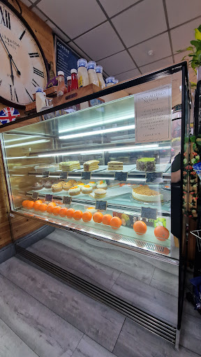 You get a loyalty card, too, and there's plenty of seating inside and out. Multiple selection of food from sandwiches - veggie and meaty, samosas, and pizzas with snacks, cakes, and refreshments.