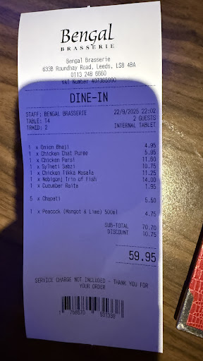 Ordered a takeaway delivery yesterday just after 5pm when it opened. When I put the order through the guy on the phone said it will be 15-20min. It was now coming to an hour so I called and they said driver is on his way, so I waited. Then car pulls up right outside my house. So Iām wandering heās outside in his car I could see him having a casual conversation on his phone and was now coming to over 5mins heās been chatting. He now turns up, I open the door and say to him youāve been in your car over 5mins on your phone, to his reply, he said he was looking for the house, stupid liar. When I took all the food out the oil from the curry had leaked in the bag and as Iām an Indian myself and an avid cook, been to many restaurants in the uk and globally, the food was terrible even though I mentioned to the guy to make it very spicy when placing the order. This is why most Asians will not order from most Indian restaurants and takeaways as they know the food will be rubbish and tasteless and pretty much catered for the non Indian market because they know they can get away with making rubbish food. I definitely would not order from Bengal...