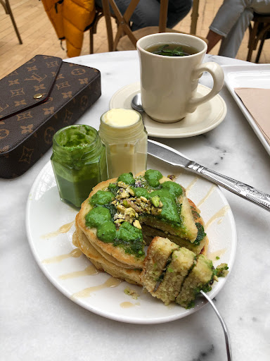 Today, I tried Bruschetta's new Baklava pancakes (pancakes with pistachio and honey). I cook quite a lot at home and so when eating out I try and go for things I couldn't make myself, or at least with ingredients I wouldn't normally use. Bruschetta's food always leaves me feeling inspired by their flavours and presentation, and today was no exception. I got three pancakes (it doesn't look like much on the plate but for me it was the most perfect portion size, nothing was left and I couldn't have eaten any more) and they came with two little pots, one of a pistachio drizzle made from pistachios and condensed milk, and one of their homemade cream. I was worried the pancakes might be a little sickly, but they were sweetened to perfection. Bruschetta get it right every single time! I also had a fresh mint tea and it paired perfectly. Their waiters are efficient, friendly, welcoming and many of their ingredients are locally sourced. On other occasions, I've also tried their juices (they often make recommendations of fruit combinations but you can also pick any three from the crates of fresh fruit at the till and they will press it into a glass for you) which are utterly refreshing, I've also had their Algerian crêpes as well as their apricot & mango pain perdu (french toast) and all are divine. Every family member and friend that comes to visit, I always take them to Bruschetta and they are left in as much awe as I am of their originality and creativity with food - so far I've taken 6 and the general consensus amongst us all is the same! I will be back to keep on ploughing through their menu soon and if I could give them more than 5...