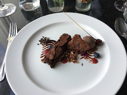 And onto dessert. Round one was a sticky toffee cake topped with vanilla and a raspberry gel together with ice cream and meringue. Not an impressive start to the sweets with cake lacking anything special and reminding me of the type of cake found behind clear plastic flaps in motorway service station restaurants. Well presented though. The second dessert was dark chocolate and rose brownie with brittle, hazelnut, praline, salted chocolate ice cream and bilberry. All very tasty in a chocolate overload kind of way but again nothing stand out or unusual. The chocolate "pop rocks" which crackle in your mouth seemed somewhat gimmicky, unnecessary and cliched.