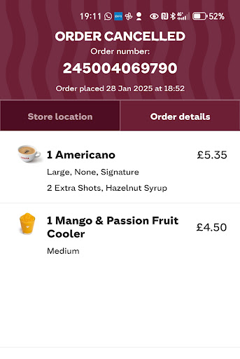 I ordered 2 drinks on app at 18:52 for take away order with a 6-8min collection time order was accepted.