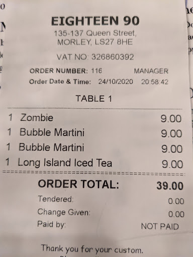 By this point the table had tipped another time and a bottle of beer had spilled on my friends dress which we asked for some napkins and again something to put under the table leg which we never got... we finished this round of drinks and decided that was our night at Eighteen90 finished.