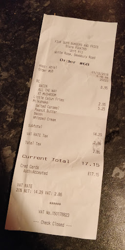 Read moreWe have been meaning to give this place a try for a while now but we are absolute lovers of Nibble@ the Dock in Hull and a fairly close second is Urban Burger so Five Guys were going to have to be pretty impressive to beat either of them and unfortunately it didn't rate anywhere near. It was quite empty when we visited on a Thursday dinner time so got served straight away but it seemed a quite a long wait for our food considering there were only 4 other people dining at the time. I ordered a small cheeseburger all the way, my hubby had the regular and we got a small portion of salted fries to share. The bun was just a bog standard sesame one, nothing special and the burger was quite dry and chewy, onions not cooked enough, and even though I'd opted for mine to have all the toppings I didn't have any mushrooms on mine, as for the fries they were very dry, limp and with no flavour whatsoever, and despite washing our hands several times throughout the day the smell of cheap burger lingered on them, quite ironic given that it cost nearly £19 for what we had. Overall I would say based on our experience Five Guys is overcooked, overpriced and underwhelming. Plus side the staff working there were lovely so they have that going for them, but we won't...