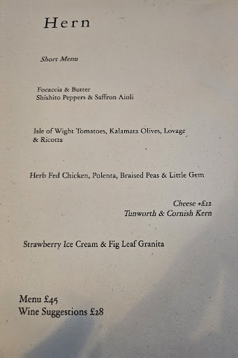 Read moreWe went here with high hopes but didn’t think the experience matched the reviews so far. The two times we called to book we were told rather abruptly (rudely!) that there were no tables. We thought that was a good sign at least that the food was good. It was generally ok, main meal very small and the service felt rushed - you really do literally have the table for a set time. Whilst the price is ok for the four courses, you inevitable end up buying wine and the best part of 200 pounds later for two people, you’d think the service would be a little better - waitresses didn’t do a great job of pretending to be interested in talking to customers. Black Market food in our view is much better, as is the service. That said, it may have been an off day at Hern as clearly there’s many reviews...