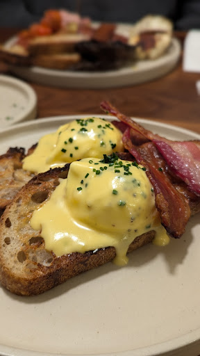Our order was a Laynes Veggie breakfast for my friend, with an oat flat white and an Eggs Benedict on Sourdough for myself with a dairy latte. The coffee came swiftly and I personally thought it tasted really nice, I couldn't get a photo for the review that did it justice down to the yellowed lights making it look naff, but it was hands down one of the better brews I've found in Leeds. Eggs Benedict is a favourite of mine as you'll see from the reviews I post, I judge places initially on how they do this dish and today, Laynes smashed the test. Two perfectly poached eggs with golden runny yolks atop two pieces of sourdough toast with not too crispy bacon was a solid display. Topped with a zesty, creamy hollandaise sauce and chive, this was arguably one of the better Eggs Benedict I've had. My friend had the veggie break which is where our only minor complaint (if you can call it that) came from. He hates eggs and asked for it to be swapped out which was a polite no as the venue doesn't do swaps. He somewhat expected that which is where his bit of disappointment came from, if you're of the veggie persuasion but don't like eggs, you're kind of out of luck. I didn't mind though, I got two additional poached eggs as he didn't want them - score.