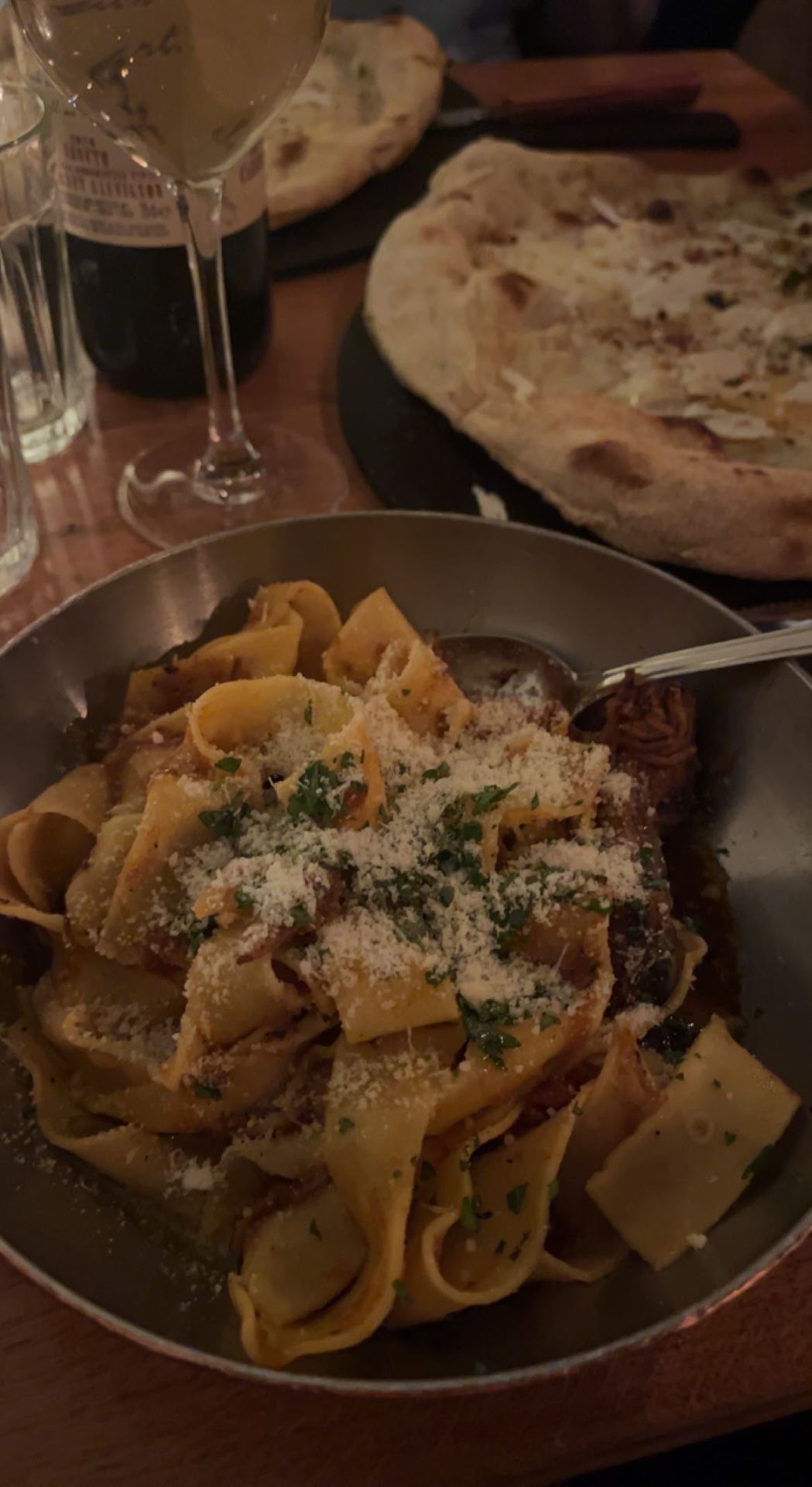 One friend ordered the tomato pasta and was disappointed to receive a creamy version instead. While the pasta itself was cooked al dente, the sauces overall were very poorly balanced, with the salt and pepper overpowering any other flavor. On the upside, the pizzas did seem to be enjoyed by those who ordered them.I really understand that with such large tables it is difficult to achieve a hot temperature for a variety of dishes , which I would suggest to be served as soon as they are ready. We also did pre order if that helps.