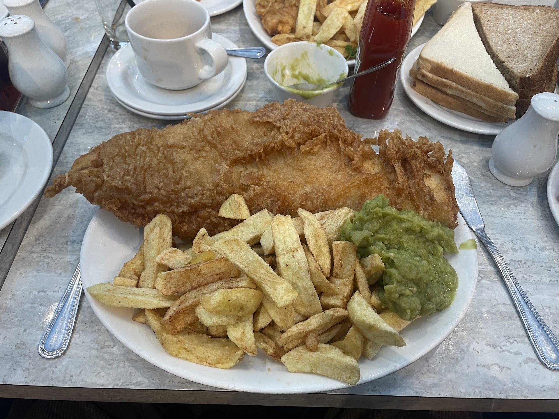 Ordered the standard fish and chips but fried in oil rather than the beef dripping typically used, due to religious reasons. (Have had the beef dripping version before I knew what it even that's what they fried in. It's even better than the fried in oil fish and chips). The fish was cooked to absolute perfection. Gorgeous piece of fish which was meaty and held it's structure well but flaked perfectly. The batter was nice and crunchy without the soggy innards which you get from usual fish and chips shops. It wasn't greasy at all and both myself and my friend actually ate the batter. We normally remove it and eat just the plain fish inside.