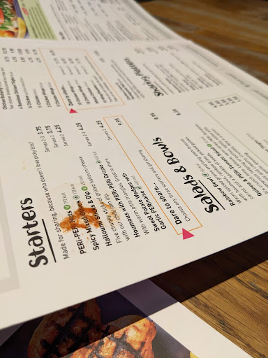 Not the best Nandos I've been to in terms of customer service ;/ Nobody around to seat us so went to the bar to ask if we could just sit down. The lady in burgundy said to sit down and that she was going to give me some menus She didn't even glance at me whilst speaking. Then I wondered back to the entrance (with no menus) and we were seated a few mins later. My friend ordered and then me. Waited around 25 mins before asking where the food was. Mine came 1 minute later but my friend waited a further 5 mins. When her food eventually arrived it was the wrong order :/ sent it back and waitress came back 5 mins later. However, this time it was stone cold :,( my friend didn't want to complain again so just ate her cold lunch. Spoke to the waitress afterwards and she said "it should have been warm" and walked away. Won't be going back to this nandos. Staff need more training as some nandos have excellent customers service this is defo not one of them. My food was okay but I didn't get any butter...