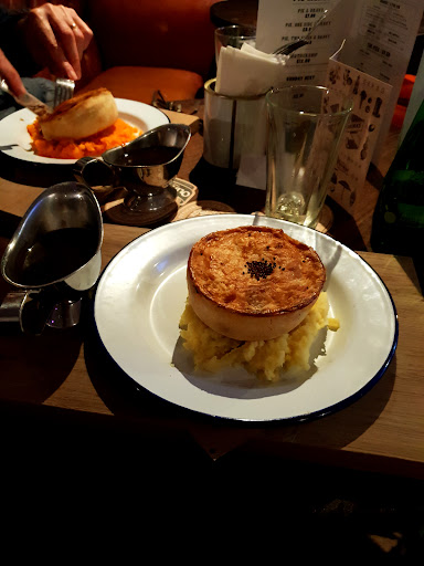 Lovely food and drink, terrible service! The young lad who served me was unfamiliar with the basic pie menu and the offers being advertised. The ordering process was hard work as a result. When the food arrived my wife's order was missing mash and gravy. Even when I produced the receipt clearly showing the order it took him some time to stop questioning that they had got it wrong. I had almost finished my meal before he returned with my wife's plate. It shouldn't have surprised me that when my wife cut into the pie she found it was the wrong one, steak and Stilton rather than chicken and mushroom. My wife did not want the fuss of sending the order back again so made do with it. This really isn't good enough given the price we paid and it lets down the quality of the food and...