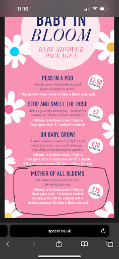 The package as advertised was meant to include floral decorations, a âmummy to beâ flower crown, baby in bloom game cards, cocktails or mocktails, a baby grow craft kit for each person, and tote bags. We paid ÂŁ15 per person (ÂŁ165 total), yet there wasnât a single floral decoration in sight, the mummy to be flower crown was missing, and we were only given one baby grow craft kit to share between 11 people â which completely ruined the activity i had planned as the mum-to-be.