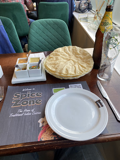 What can I say about Spice Zone...apart from AMAZING. I've been looking for a decent curry house since I moved to Leeds from Bradford and now I've finally found one.... The feast started off with 3 poppadoms, a very pleasant surprise as we hadn't ordered them. They were tasty, crispy and very moreish especially when accompanied by the onions and riatta. We then got our taste buds around the Special Mix Starter for Two, too many times when you order one of these, you are left disappointed by both the quantity and the quality, NOT SO IN THIS CASE...... The Chicken Tikka was moist and tasty, the Lamb Tikka, perfectly cooked with just the right amount of spice, the Onion Bhajis, Crispy and flavoursome, the Chicken Rolls, delicious with just the right amount of crunch and then finally the Seekh kebab, perfectly spiced with the perfect balance of taste and kick.... Nic also got some Mushroom Pakoras and going by the appreciative sounds coming out of her mouth, I'm guessing she enjoyed them. We then got onto our Main Courses, we both decided on the Bhunas, I went for the Meat Bhuna and Nic went for the Chicken Tiikka Bhuna, both were superb, not too spicy and bursting with flavour. The amount of meat that you got was amazing, too many times, you get loads of sauce and very little meat, I'm happy to say...not here..... Overall a fantastic meal from a fantastic place... the staff were friendly, professional and very welcoming... WE WILL...