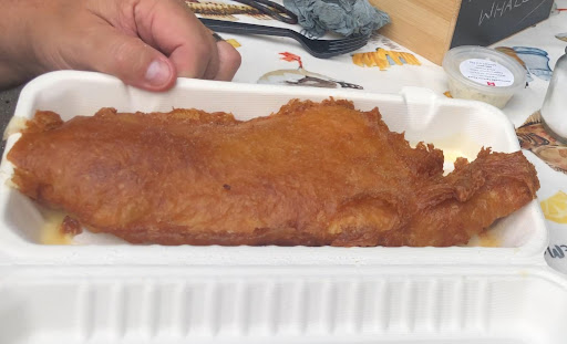 I opted for the Whaler Haddock, which was a thick jumbo fillet encased in a dark, crispy batter. The batter had a colour I had never experienced before, but the taste was excellent, as was the haddock. However, the chips were pale, much too firm, and rather bland. The potato scallop was a bit oily (beef dripping) and, like the Yorkshire fishcake, could have benefitted from being left to drain for a minute or two before packaging.