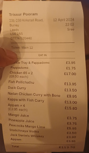 Read moreThis restaurant brings the diverse Kerala South Indian cuisine style of cooking to Burley in Leeds and it does not disappoint. It is situated about a mile out of the city centre on Kirkstall Road with Weaver Street serving as free off main road parking next to it. The layout is one of a long linear set up (formerly Meat is Dead premises) and delving deeper into the area affords reasonable quietness. We visited 6:00pm, when initially, no other customers were present. A great place to drink our mango/ lime apple cider (highly recommended) and to watch Leeds go by and start to relax after the working day. Kerala is 'The Land of The Spices' so if you order a spicy dish- expect it to be just that. We had popadoms and pickle tray starter. The pickles ranged from cooling to piquant and complemented the crisp light popadoms. This being our second visit, I noted that the menus have now been professionally prepared and presented with a more condensed, but nevertheless varied menu, with English explanations outlined below. My starter of Chilli Chicken was both generous and cooked with a spice base that beautifully built in flavour and strength as it was consumed. The lovely waitress, they all have impeccable manners and cater to you individually, pre-assured me that if it was too spicy she could bring a yoghurt cooler. My son's onion bhaji didn't disappoint either. It looked evenly cooked and was a generous portion. I could see the staff's attentiveness with regular glances to see if we had finished each course before they served the next. Our waitress regularly approached us mid course to check if everything was to our taste. My Railway Mutton Curry, served with Chapatis and butter garlic rice was tasty and the meat fell apart in the mouth. My son's chicken paratha was served in a banana leaf and was both generous in portion and rich in taste. Our bill was reasonable and I gladly left a tip. This restaurant is fit to included in the Leeds City well established dining experience and I anticipate it will go from strength to strength. The Kerala method of cooking brings new smells and tastes to the run of the mill typical indian food we have so much revered and become accustomed to. We will be trying further vegetarian and fish dishes in future. Well worth our 30 miles round trip to sample. Well done this...