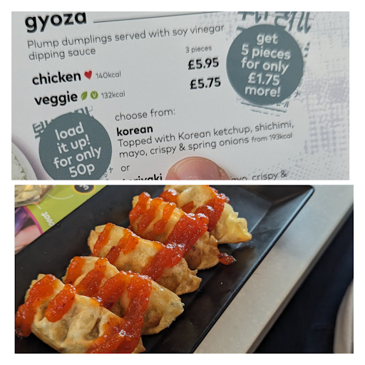 Full review: The sushi plates on the conveyor belt are a lovely touch however I noticed hardly any of the vegetarian options going around. The only information on the plates is the time for food health and safety, making it guess work as to what dish it actually is.