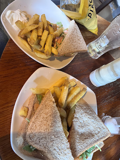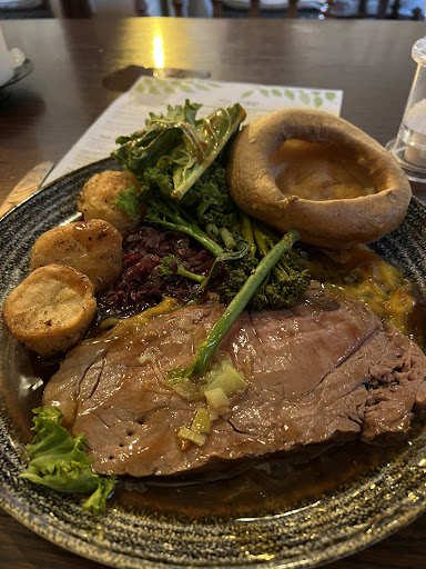 When the 3 āroast dinnersā arrived we sat waiting for a few minutes for the veg to arrive only to realise shortly after that the paltry amount of over cooked āgreensā (more brown than green) the 2 carrots, 2 straggly soggy sticks of brocoll and bizarrely a piece of beetroot were hidden (squashed) underneath the 2 ropey extremely fatty slices of beef and Yorkshire pudding - the 3 āroast potatoesā were just about peeping out from underneath and were so hard with a tough coating that it was impossible to cut them with ordinary cutlery u literally had to dig the fork in to steady them so as not to let them fly off the plate and then scrape what u could out of the inside - it would appear that these were not freshly cooked rather re heated after being sat in the kitchen being kept warm all day. We had to ask for sauces for the 4 burger meals that were ordered as none was offered and had to repeat this request a second time!