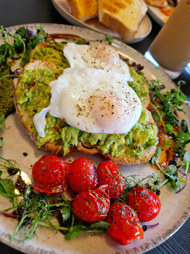 Toasted sourdough topped with a generous layer of smashed avocado, topped with two perfectly poached eggs, and seasoned to perfection. The roasted cherry tomatoes on the side were bursting with flavor, and the fresh greens, added a vibrant, refreshing crunch to every bite.