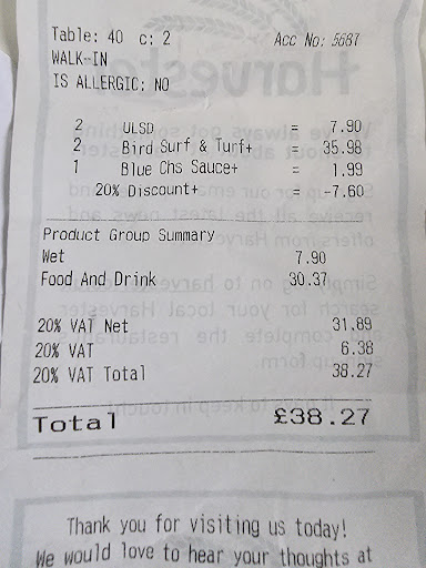 Read moreCome here a few times in the past. And I'm afraid this is my last visit, and will be unsubcribing from any emails from harvester in the future. My garlic bread was burnt, which was basically 2 bits of bread stuck to each other for £5! I asked for another one, as it wasn't to a satisfactory standard at all. They then from what I couldn't believe either bought out the same one, and scraped off the burnt bits. Or managed to burn it again. Garlic bread is not supposed to crunch when you bite into it. The refillable drinks were not working, and last of all the ribs were poor quality., overcooked and basically charcoaled to the bone. The chips were even just plain, no taste to them at all. Really cheap quality chips if I'm honest. I had to cover them with coleslaw from the unlimited salad bar just to give them a little taste. The corn on the cob was also not to a good quality, it did not look juicy like they should, it looked like a plastic toy. The ribs were not refunded, they were just giving us 25% off which was the discount code which we came in with, and the pint my friend bought with it, was just taken off as apparently the main meal couldn't be refunded for some reason. Staff were lovely, but I'm afraid the food was not to any eating standard tonight at all. Will not be returning again. Last we was waiting for the bill to be sorted for about 15 minutes. We went up to ask to settle the bill. Also may I add it was not busy tonight at all, so there was no excuse for the food to be...
