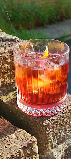 was thinking of an espresso martini. I was offered a Negroni. I settled on a Negroni. I can make a Negroni . This was different , a floral aroma. I inquired. It was the way the orange was expressed. I should have paid greater attention. I did though notice thin peel off the orange. I cut a wheel cut in half, run around the rim, drop into the cocktail.