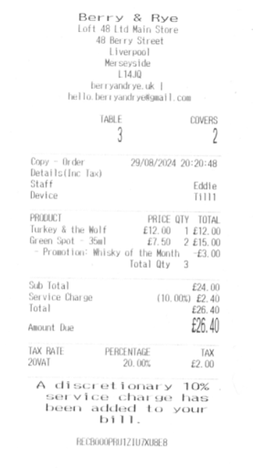 But that’s not all. When we received the bill, we saw that, on top of the £24 bill, they had added a “discretionary service charge” of 10%, meaning £2.40 more, for a total of £26.40 for three tiny drinks.