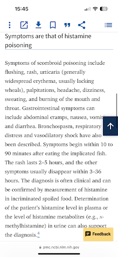 We do not believe you sold 4 tuna steaks and Liverpool council should have checked you sold 4 of the tuna steaks. We could not follow the procedure due to being a student in Liverpool and not being registered with a Gp. đŻ Scombroid food poisoning, also known as histamine fish poisoning, occurs when eating fish contaminated with high levels of histamine. It's a common type of food poisoning that resembles an allergic reaction. Symptoms can appear within minutes to hours of eating the fish and include: Rash Facial flushing Headache Diarrhea Sweating Burning mouth sensation Difficulty swallowing Heart palpitations Symptoms usually resolve within a few hours, Because of the tuna steak you stored you cooked and you served.