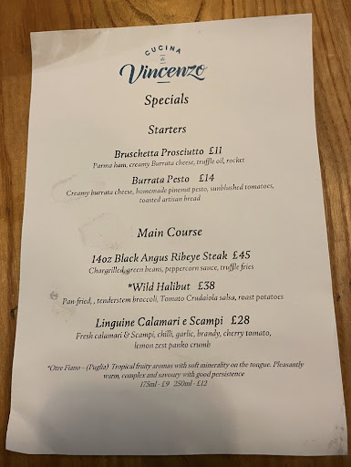 Read moreSo what to say. What a gem. And a rare one at that! Taken here by a dear friend, thanks JJ! They live near but never been. Had heard of its growing reputation and we were excited to give it a go. Not in the centre of Liverpool, but not too far in a Uber. Late lunch at 1515, but it still had a great buzz from lunch-service. Tables continued to fill even after we arrived. Great table service from all. Shout out to Max! Love what they do here, seems they give youngsters a tryout as front of house, under supervision of course. But once they are up an running they have the room. So yes great service and it felt genuine too. So we had a two-hour slot, again a good sign in my book of an up and coming eatery. It said Italian on the door, on the menu and that is exactly what we got! The menu had a great choice, not too many thankfully. Some classics of course but do ask for what Special that day. Love seafood and we all went for that. Hope the pics work for you, because the taste did for us. Superb, every dish. Italian generosity on portion sizes too! Of course had an espresso - that is my guide to a decent Italian. Glad to say it hit the spot! We were talked into a dessert, we did not need it! But the homemade Bakewell is a must. OMG it's amazing. But be warned .... one to share (between three) was more than enough. So there you are, a great find outside the centre. Great at night as there are a number of places here, next door and across the street to also consider. Oh one thing .... you will and should book for Vincenzo, can't see you getting a table at night without!...