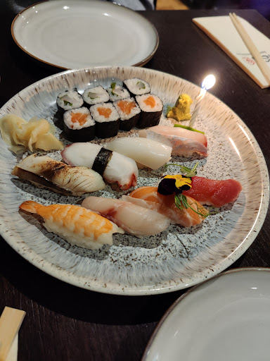 Arrived earlier than our reservation on a rainy Sunday evening which was no problem. Chose the chef's choice mixed sushi plate first and we were delighted! Unlike the chain sushi place nearby, it wasn't only tuna and salmon but also seabream, surf clam, octopus, mackerel, yellowfin tuna and more. All very fresh - perfect. The sushi was presented as an art form, as I remember it from the favourite sushi places I've been - much more like a California Japantown. Edible flowers, lovely fine seaweed. The chef treats it as the delicacy it is which adds to the experience, I think. And, by the way the lovely server who brought it sang a few lines of the birthday song very quietly to us, which was really cute. She could tell my companion would be embarrassed by a fuss. The platter arrived with a single lit birthday candle. Celebratory but not over the top.